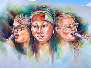 2019Mural with girl with flowers, blue beads, Statia pride logo